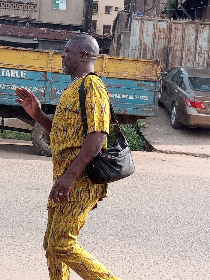 The image depicts an urban outdoor scene in the city of Unknown, Unknown. An adult male is prominently featured in the foreground, walking from left to right. He is dark-skinned, with short, greying hair and a greying beard. He wears a short-sleeved shirt and matching trousers, both adorned with a yellow base fabric featuring red and blue geometric patterns. A black shoulder bag with a brown strap is slung across his body, resting on his right hip. A silver-colored ring is visible on the ring finger of his left hand, which is raised with the palm facing forward and fingers slightly splayed. In the midground, behind the man, a light blue flatbed truck with yellow side rails is partially visible. Text on the truck's side includes "TABLE" and "NAFDAC REG. NO. DI-1279L". To the right of the truck, a gold or light brown sedan is parked, facing away from the viewer. The background consists of various buildings and structures, including a wall with a rusted metal gate. Sparse green vegetation is visible near the parked sedan. The ground is paved, consistent with a road or street surface, and the scene is illuminated by daylight.