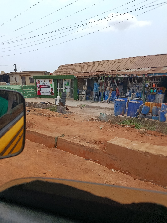 street scene in Mowo Kekere, Nigeria, with a building on the right side of the image. The building has a brown roof and green painted walls with several open stalls. In front of the stalls are various barrels and plastic containers. There is a sign on the building with the words "Silver-Care" and an image of a young boy and girl on it. In the foreground, there is a dirt road with a concrete ditch and a large green car mirror partially obscuring the view. The street appears to be unpaved. The image was taken from inside a car. The sky is overcast and there are power lines running across the image. The image appears to have been taken on a weekday, with the building open and the stalls occupied. The location of the image is estimated to be in the Mowo Kekere neighborhood of Lagos, Nigeria, based on the coordinates provided (latitude: 6.606, longitude: 3.586).