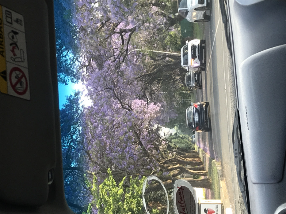 The image depicts a street scene in Bassonia, Johannesburg, South Africa, viewed from inside a vehicle through its windshield. The upper portion of the frame shows the vehicle's dashboard, the base of the passenger sun visor with an "AIRBAG" warning label, and the windshield. The primary subject is a tree-lined road, heavily canopied by blooming Jacaranda trees displaying abundant purple blossoms. Fallen purple petals are visible on the road surface. On the left side of the road, a white sign with a "Halfway" logo and the text "(011) 947-8800" is visible, identifying a Halfway Ford or similar dealership. Below it, a red and black logo with "TACTICAL" is partially visible. Further left, a tree with green foliage stands among the Jacarandas. Several vehicles are present on the road. In the left lane, a dark-colored sedan (possibly a Mercedes-Benz, license plate "GP 56 [...]") is driving away from the camera. In the right lane, a white SUV with distinct LED headlights is approaching the camera, followed by another dark-colored sedan. A white SUV is partially visible on the far right, possibly parked or moving slowly. The sky above the trees is bright blue, indicating daylight conditions. No individuals are explicitly visible. The scene captures the distinctive appearance of Johannesburg during the Jacaranda blooming season.