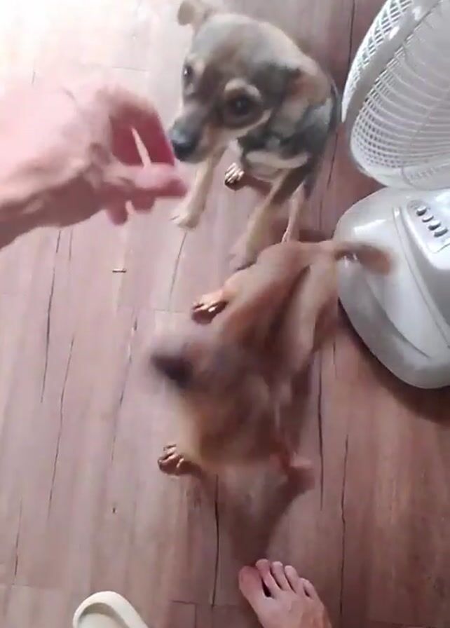 A first-person perspective video shows two small dogs on a wooden floor, next to a white electric fan. One dog is brown and eager, jumping up to lick and nip at the hand of the person holding the camera. The other dog is grey and observes the interaction. The person’s bare foot and slipper-clad foot are also visible.