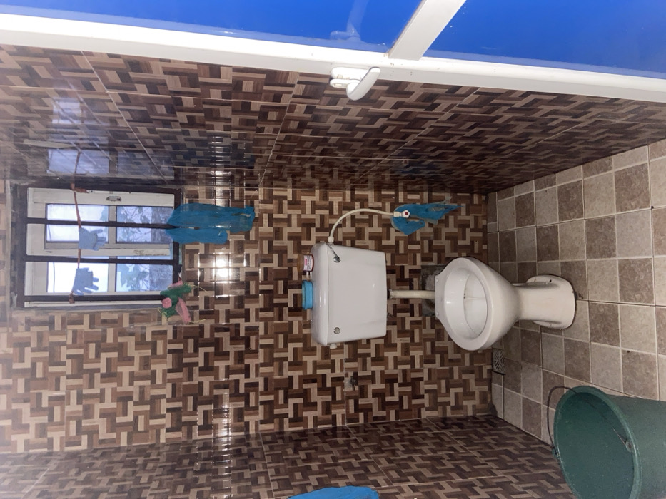 A bathroom features a window, toilet, and bucket. The window is framed with dark trim and bars. The walls are covered in square tiles, with brown-toned geometric patterns. The ceiling is a bright blue color. There are blue cloths hanging or draped near the window and toilet. The floor is tiled with a similar pattern as the wall. A green bucket sits on the floor near the wall.