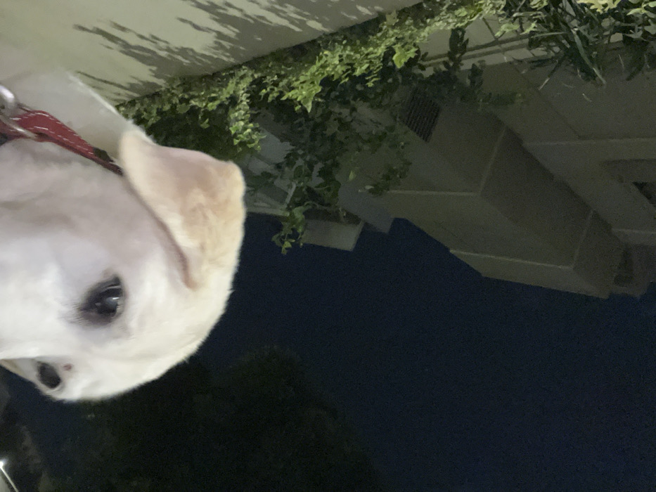 A white dog with a red collar is prominently featured in the upper left corner of the image. Behind the dog are building structures and dense green vines with leaves, creating a natural yet urban backdrop. A portion of the image is filled with dark blue, which seems to indicate night. The image seems to have been rotated to a landscape position.