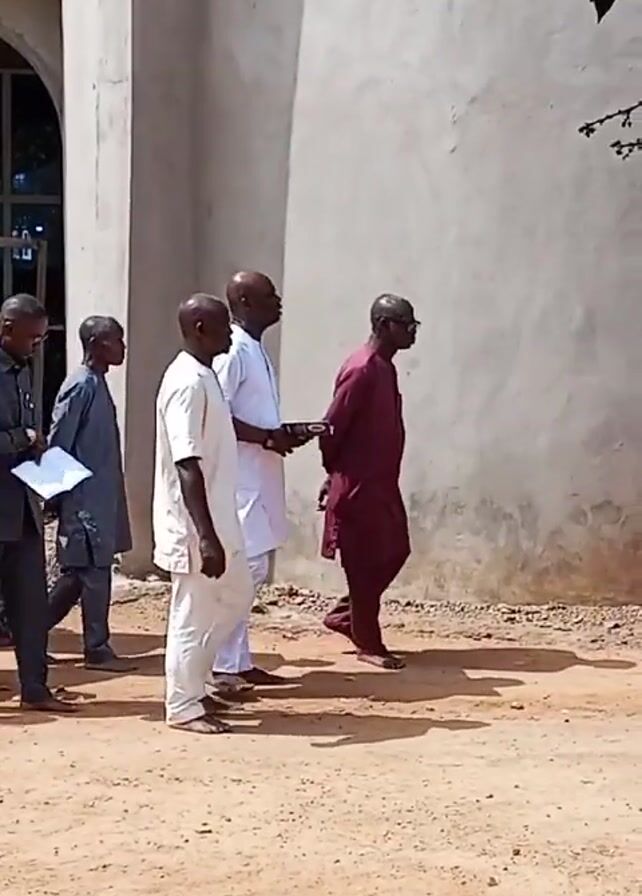 A group of about 20 men are walking together on a sandy path outdoors. Most of the men are wearing long-sleeved, traditional African clothing in a variety of light and dark colors. Some men are carrying notebooks or papers. The group is walking away from a building with white arches and windows. The weather appears sunny.