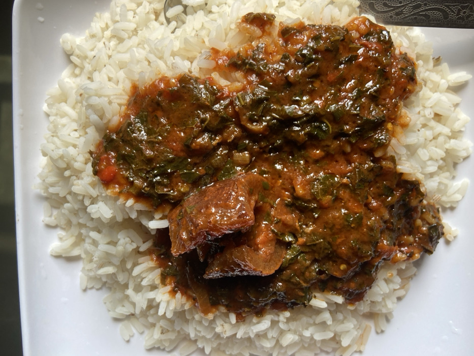 A white oval or rectangular dish, potentially ceramic, holds a serving of food. The base consists of white, long-grain rice, piled to fill the dish. Centrally placed atop the rice is a reddish-orange stew or sauce containing numerous dark green leafy vegetables, consistent with spinach or similar greens. Embedded within the stew are several irregular, reddish-brown pieces of cooked meat or protein, varying in size. A portion of a metallic eating utensil, likely a spoon or fork handle with an embossed pattern, is visible along the bottom right edge of the dish. The scene is located in Oba-Aboji, Nigeria.