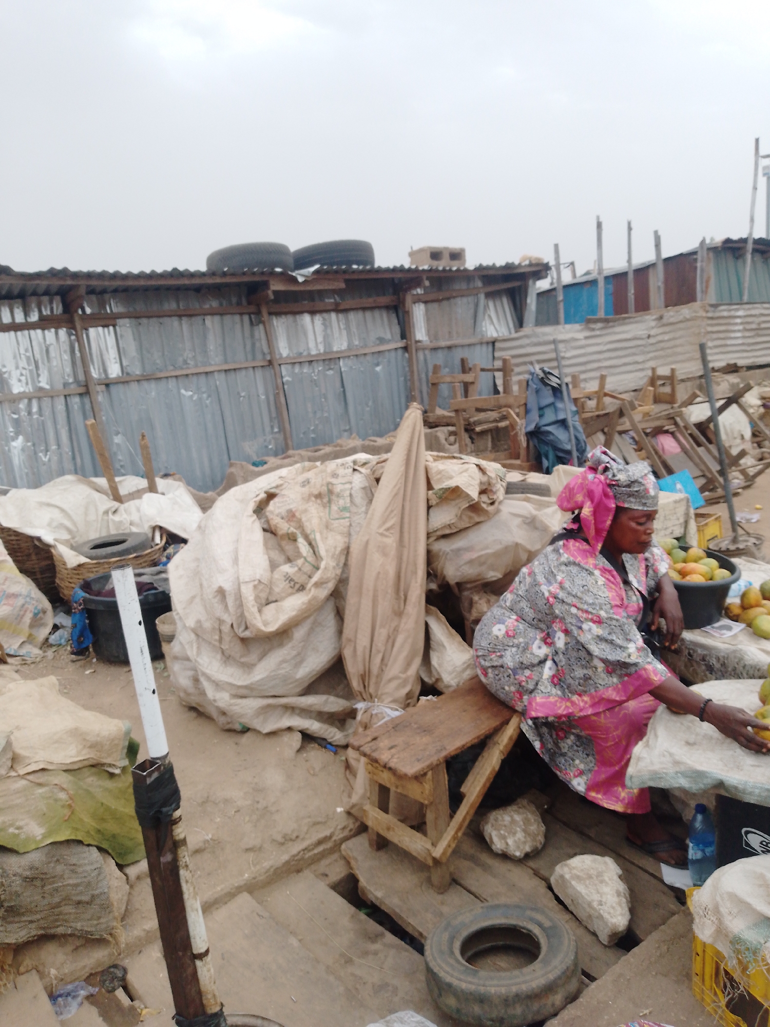 A woman sits on a small wooden stool at a market stall in Sabon Tasha, Nigeria. She wears a floral print dress with pink accents and a matching headwrap. She appears to be selling fruit, as a black bucket filled with mangoes is visible on the table in front of her. The market is constructed of corrugated metal and wood, and there is a general sense of disrepair in the setting. There are tires on the roof of one of the stalls. Other materials, like white sacks, baskets, and blue tarps, are scattered around the woman and the stalls.
