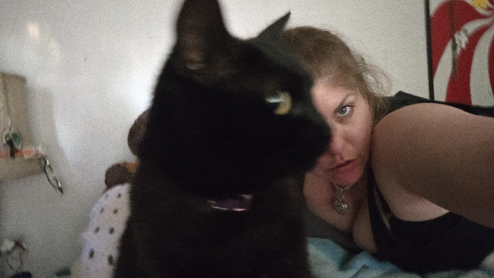 A woman with fair skin, blonde hair, and blue eyes is angled towards the camera, wearing a black top and a necklace with a skull pendant. She is partially lying down on a blue surface. A black cat with yellow eyes, wearing a purple collar, is prominently positioned in the foreground, partially obscuring the view. A white wall, a bedside table with keys, and a poster with red and white stripes are visible in the background.