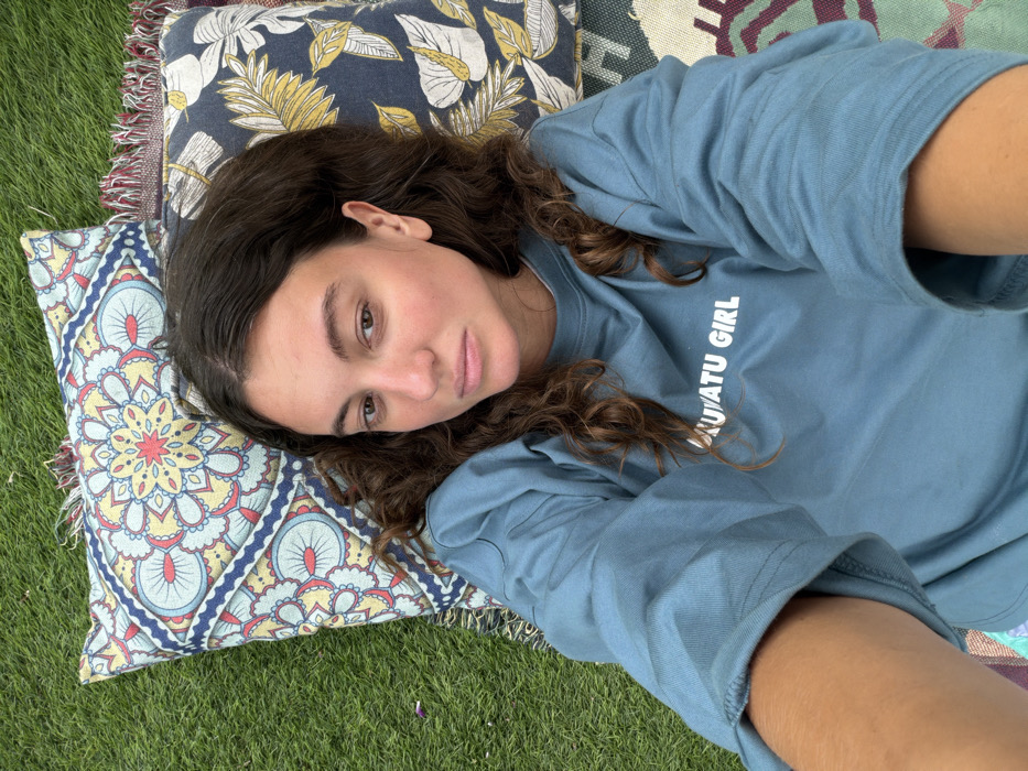 A young woman with curly brown hair lies on her back, propped up by two decorative pillows on a patch of green grass. She wears a blue long-sleeved shirt with white lettering. Her gaze is directed towards the camera with a slight tilt of her head. The pillows have different patterns, one floral and the other with a mandala design. The scene is shot from a high angle, capturing a relaxed and casual moment outdoors.