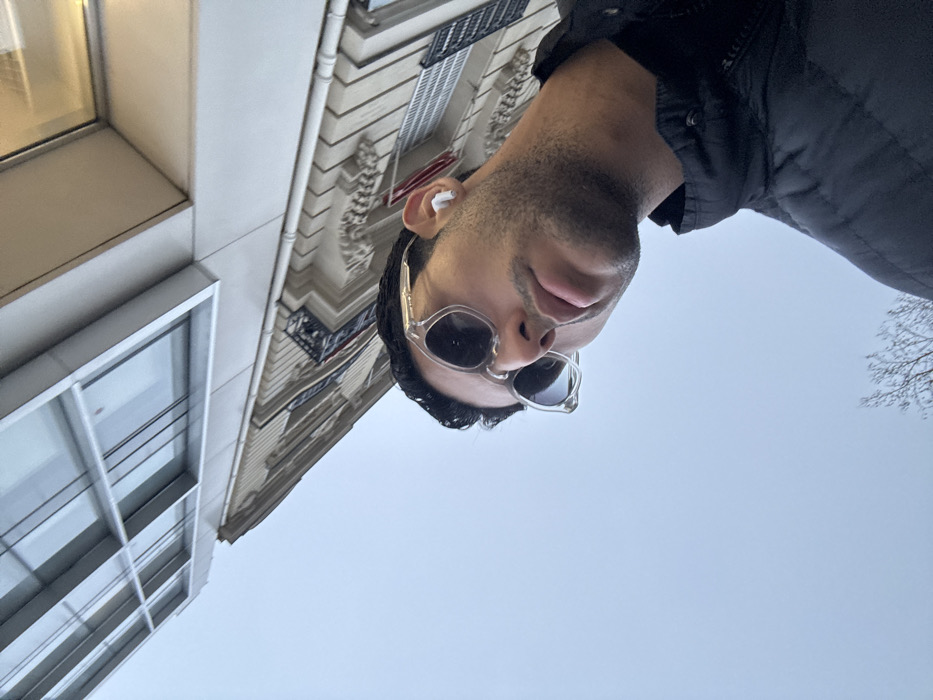 A low-angle photograph taken in Neuilly-sur-Seine, France, depicts a male subject occupying the lower right foreground. The individual has dark hair and light facial stubble, wearing clear-framed sunglasses with dark lenses and a white wireless earbud in his right ear. He is clad in a dark, possibly black, quilted jacket. The background features an overcast, light grey sky. Architectural elements include a modern building with large, rectangular reflective windows in the upper left, positioned above an older, classical-style building with ornate balconies and detailed stonework. Bare tree branches are partially visible against the sky in the lower left.