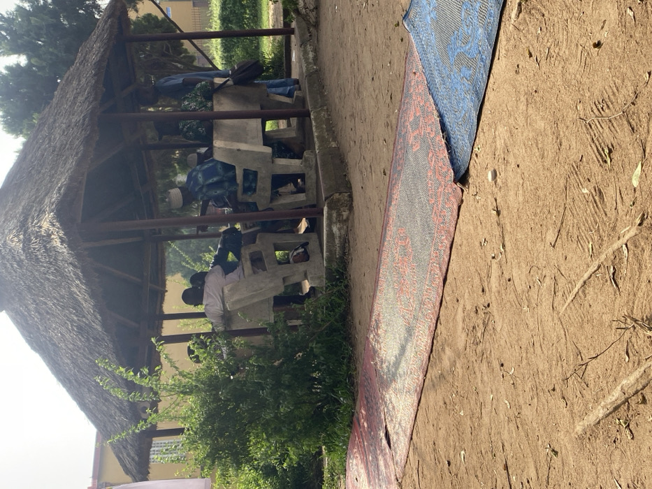 People gather beneath a thatched-roof structure supported by wooden pillars. They sit on concrete benches arranged in a row. In the foreground, a green bush is visible. To the right, two mats lie on the ground, one blue and the other patterned with red. The ground is dirt and is covered with fallen leaves and twigs.