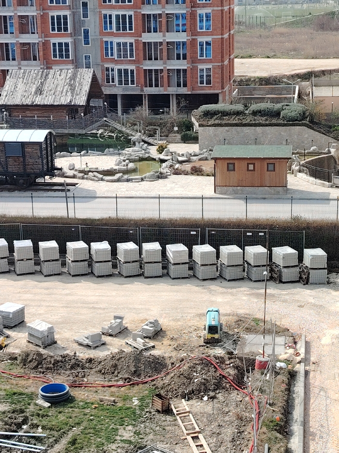 This image captures an elevated perspective of a multi-layered urban environment in Plovdiv, Bulgaria, under clear daylight conditions. In the upper background, a multi-story residential or commercial building is prominent, characterized by its red brick facade and numerous evenly spaced rectangular windows with white frames, some reflecting a blue hue. To the right of this building, a vast area of dry, light-brown terrain with sparse vegetation and distant fencing extends under a bright sky. Mid-ground details include a landscaped recreational area. This zone features multiple interconnected, irregularly shaped ponds containing greenish water, encircled by light-colored flagstone pathways and decorative rocks. To the left, a rustic, dark-stained wooden building with a pronounced pitched plank roof stands near the ponds. Adjacent to it, a dark-brown wooden train wagon with a white roof rests on tracks. To the right of the ponds, a small, light-brown wooden shed with a green gabled roof and three small square windows is situated. Behind this shed, a stone-clad retaining wall supports an elevated section densely covered in low, dark green shrubs. A black metal mesh fence separates this landscaped area from the lower foreground. The foreground depicts an active construction site. Immediately below the black fence, a linear arrangement of approximately fifteen stacks of grey building materials, likely paving stones or concrete blocks, are neatly organized on wooden pallets, each stack two units high and wrapped in white protective film. The ground consists of disturbed earth and gravel. Further into the foreground, a small, light-blue compact excavator is positioned on the right. Various smaller concrete components, some on pallets and wrapped in white, are scattered across the uneven dirt surface. Red hoses or cables crisscross the ground, along with a blue plastic basin or culvert section, a wooden crate, and a series of wooden planks resembling a ladder. A slender pole with an attached fixture is also visible. No individuals are present in the scene.