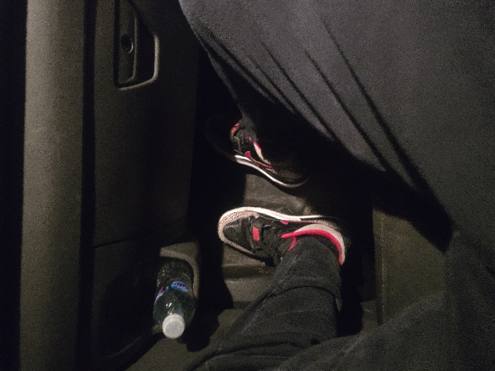 The scene depicts the interior of a vehicle, viewed from a slightly elevated perspective, focusing on the footwell and lower dashboard area. Two human feet, belonging to one individual, are visible. The individual wears dark-colored trousers, likely jeans, and athletic shoes. The left foot is shod in a black, white, and red athletic shoe, resting on a dark floor surface. The right foot, also in a similar athletic shoe, is partially visible towards the right, casting an elongated shadow across the dark-colored floor. Above and to the left of the feet, a clear plastic bottle of water with a white cap and blue label is resting horizontally in a recessed storage compartment on the dashboard or lower console. The vehicle interior surfaces are predominantly dark grey or black, appearing to be plastic and carpeted materials. Lighting is dim, creating distinct shadows from the feet and legs. No specific identifying features of Guildford, United Kingdom, are discernible within the image.