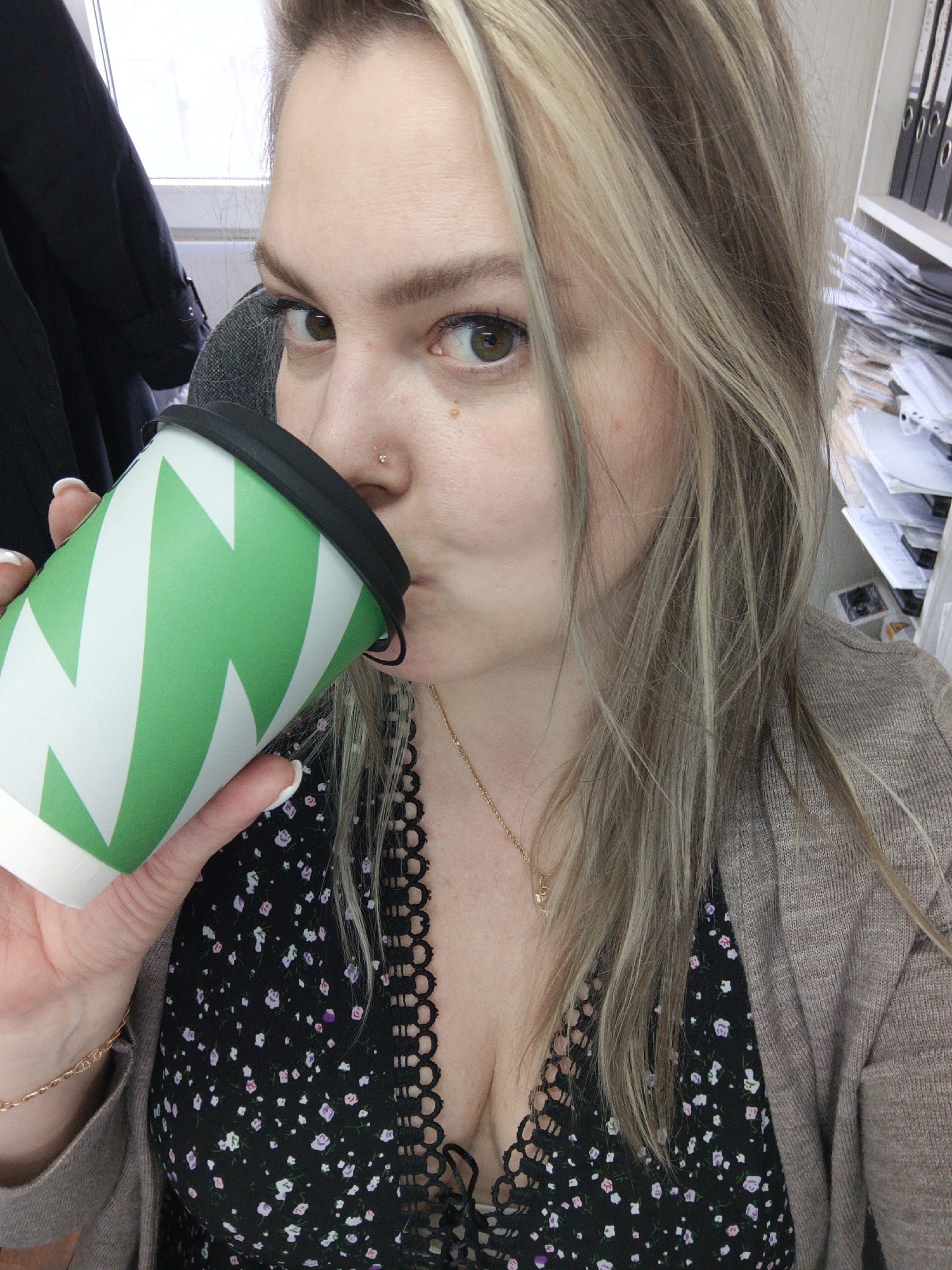 A woman with blonde hair, a nose piercing, and fair skin is holding a green and white paper cup with a black lid to her lips, seemingly drinking from it. She is wearing a black floral print dress with lace trim at the neckline and a beige cardigan. A gold necklace and bracelet are visible. Behind her are a black jacket or coat hanging, a gray chair, and a shelf or desk with stacked papers and binders. There is a window in the background. There is no evidence suggesting a location in the city of Noviy, Russia.