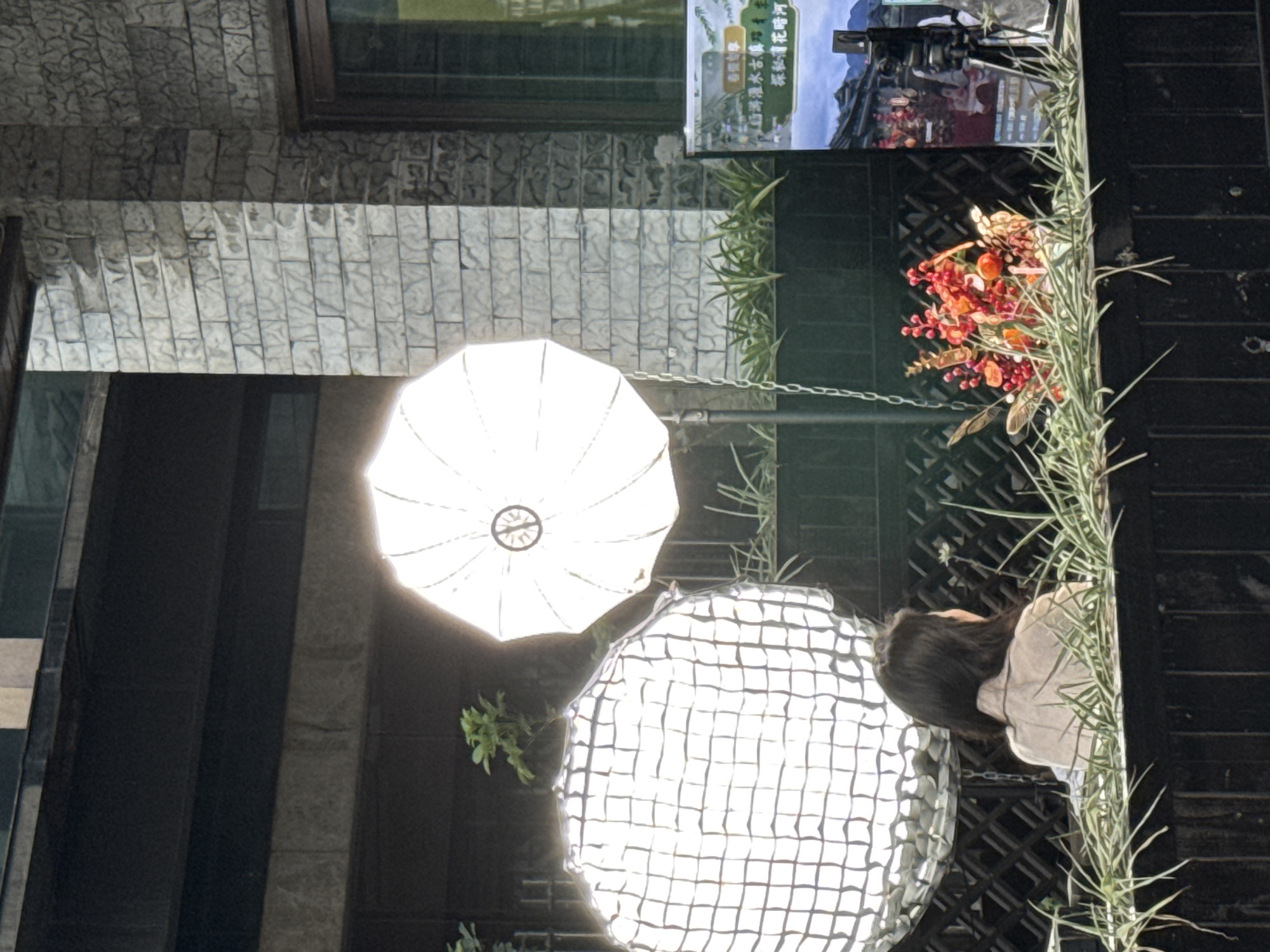 n outdoor scene in what appears to be Zhuoshui, China. The view is oriented vertically. Two softbox light reflectors are visible: one circular and white, the other grid-shaped. A woman with shoulder-length dark hair stands near the grid-shaped reflector, partially obscured by tall green plants. The background includes architectural elements like a brick wall, window frames, and a dark, patterned metal structure. A sign with Chinese characters and imagery is mounted above. There is also a bouquet of red and orange flowers.