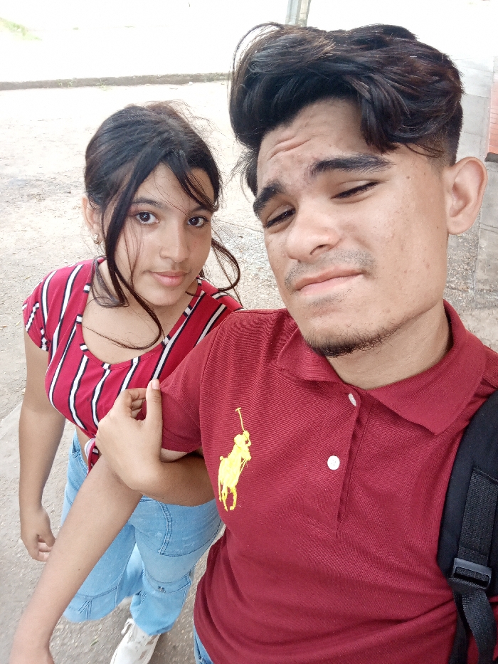 A selfie captures a young couple outside during daylight. The male, with dark hair and a red polo shirt featuring a yellow logo, has his arm around the female. She wears a red and white striped top and light blue jeans, smiling softly. They are both fair-skinned, and a hint of pavement and a building are visible in the background. The man's backpack strap is visible on his right shoulder.