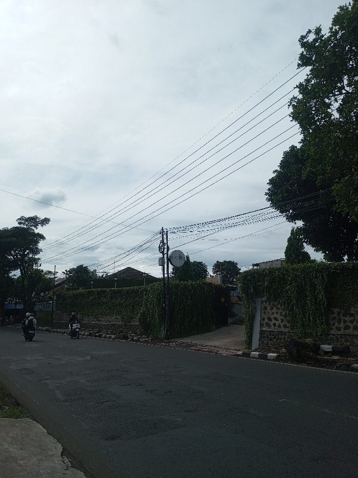 A street scene under an overcast sky. Overhead power lines crisscross the view. Two motorcycles travel along the road. A vine-covered wall hides much of the property beyond, broken only by a driveway entrance. A circular sign, possibly for a business named "Tech," is mounted on a pole. Trees and vegetation are visible throughout. The road surface is dark and shows signs of wear.