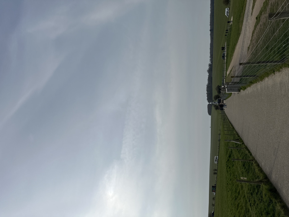 The image displays an outdoor scene near Amesbury, Wiltshire, United Kingdom, specifically depicting the pedestrian pathway leading towards Stonehenge. The sky is largely overcast with a diffused bright grey, indicative of a cloudy day. A paved, dark grey pathway extends from the foreground into the distance, centrally located within the frame. This path is bordered on both sides by wire fences attached to wooden posts, separating it from expansive green grassy fields. In the mid-ground, approximately 10-15 individuals are visible, walking along the path or standing in small groups, primarily towards the path's distant end. Several vehicles, including at least two white camper vans and other dark-colored cars, are parked on the grassy verges to the left and right of the pathway. A distinct line of dense green trees forms a distant treeline across the horizon, beyond which the land appears to be rolling green hills. At the furthest visible point along the pathway, partially obscured by distance and atmospheric conditions, are the characteristic upright stone structures of Stonehenge.