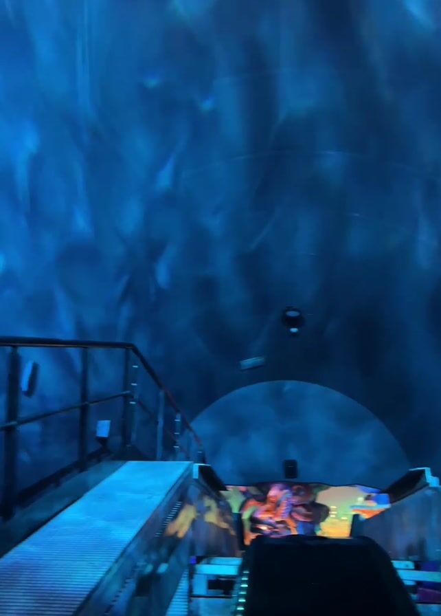 view from a moving walkway in an indoor location with blue lighting effects on the ceiling, resembling water. A metal railing is visible on the left. In the distance, people are seen on a ride or attraction, with colorful elements suggesting a theme park or entertainment venue. The focus is on the lighting and movement of the walkway.