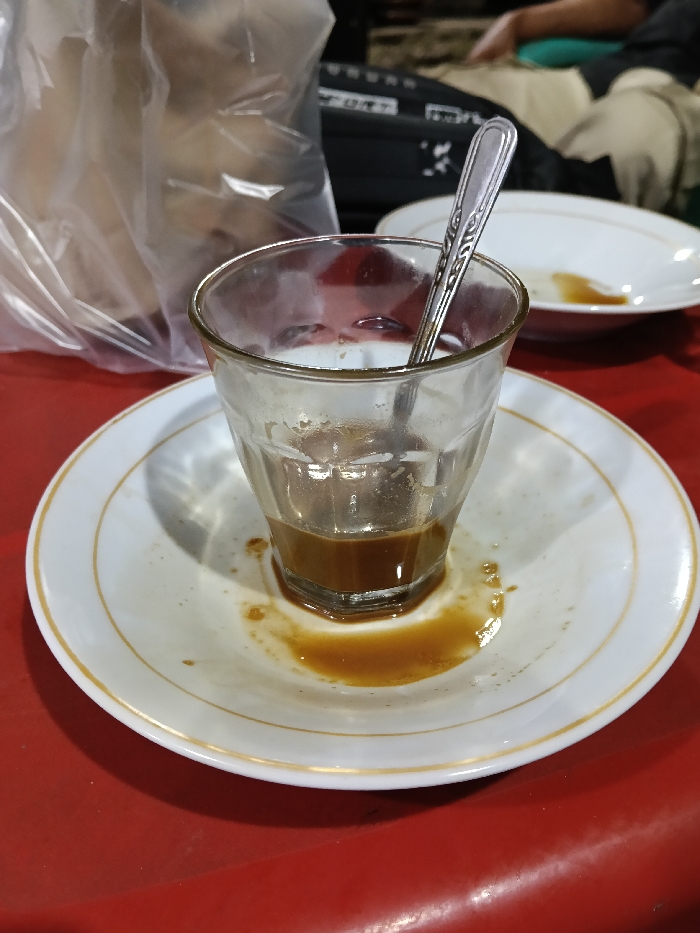 The image displays a clear, fluted glass containing approximately 20ml of a dark brown liquid, identified as a partially consumed beverage, likely coffee. A silver-colored spoon with an ornamental handle rests inside the glass. The glass is positioned centrally on a white ceramic saucer featuring a gold rim. Brown liquid residue is visible on the saucer, directly beneath and around the base of the glass, indicating spillage or drips. All items rest on a red, textured surface, presumably a table. In the background, to the left, a translucent plastic bag is partially visible and out of focus. To the right, a second white ceramic plate with a gold rim, also bearing brown residue, is present. A blurry human form, showing a person's limb in light-colored fabric, is partially discernible behind the background plate. A dark, indistinct object, possibly a bag or electronic device, is also in the blurred background. The scene is located in Blangkutacoh, Indonesia.