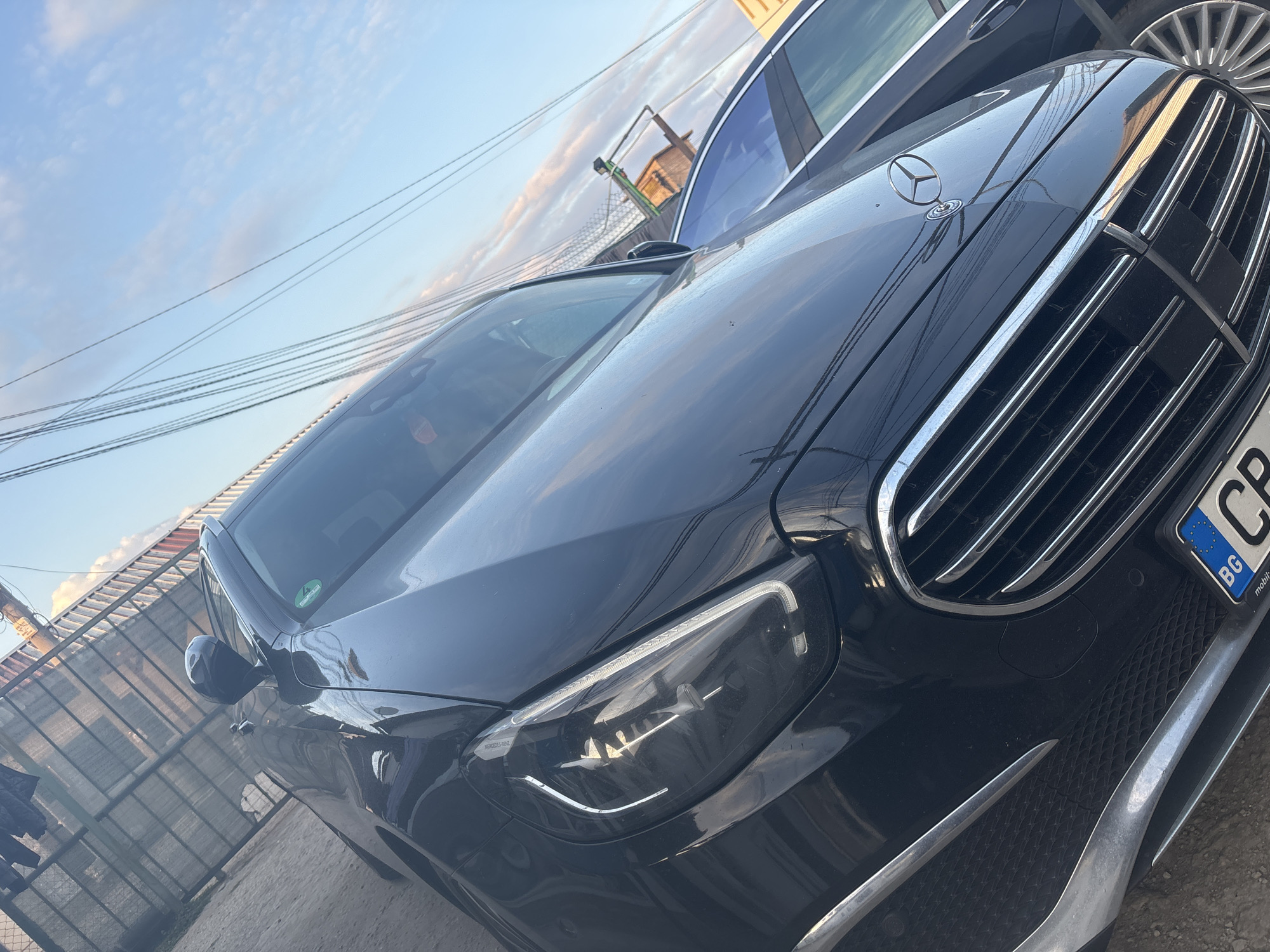 The image captures the front three-quarter view of a dark-colored Mercedes-Benz sedan, parked on an unpaved surface in the city of Elin Pelin, Bulgaria. The vehicle's front features a chrome grille with horizontal slats, a Mercedes-Benz star emblem on the hood, and a prominent Multibeam LED headlight on the driver's side. A Bulgarian license plate, displaying "BG CP" followed by a partial numerical sequence, is affixed to the lower front bumper, with "mobil.bg" printed beneath it. A green and white sticker is visible on the upper-left section of the windshield. In the background to the left, a metal-framed structure with a translucent corrugated roof is visible, beneath which several dark fabric items are suspended, resembling clothes drying. To the right of the Mercedes, the front side of a second dark-colored vehicle, featuring a multi-spoke wheel, is partially discernible. Overhead, numerous black electrical or communication wires extend diagonally across a clear blue sky interspersed with scattered white clouds. A weathered wooden structure and some metal framework are visible in the distant right background. No individuals are present in the scene.