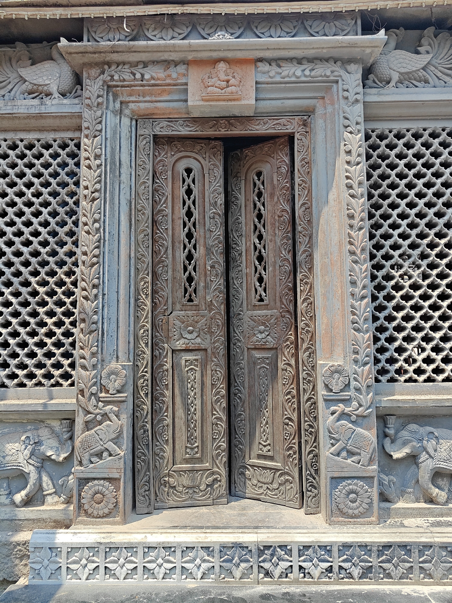 The image presents a weathered, intricately carved wooden double-leaf door, slightly ajar, set within a highly ornate stone facade. This structure is located in Kolhapur, India. The wooden door panels feature extensive floral and geometric carvings, incorporating vertical perforated sections. The door is framed by carved stone pilasters adorned with continuous leafy scrollwork and circular floral medallions. At the base of the frame, two stone reliefs depict decorated elephants with raised trunks, positioned on a patterned stone plinth exhibiting a repeating floral motif. Rectangular stone jali (lattice) panels, each with a dense, repeating quatrefoil pattern, flank the door on both sides. Above the doorway, a central deity figure, consistent with Hindu iconography, is carved into the lintel, flanked by detailed floral patterns. On the outer corners of the lintel, two peacocks with fanned tails are carved, facing inward. The entire structure displays erosion and discoloration consistent with outdoor exposure and age. No individuals or discernible activities are present within the frame.