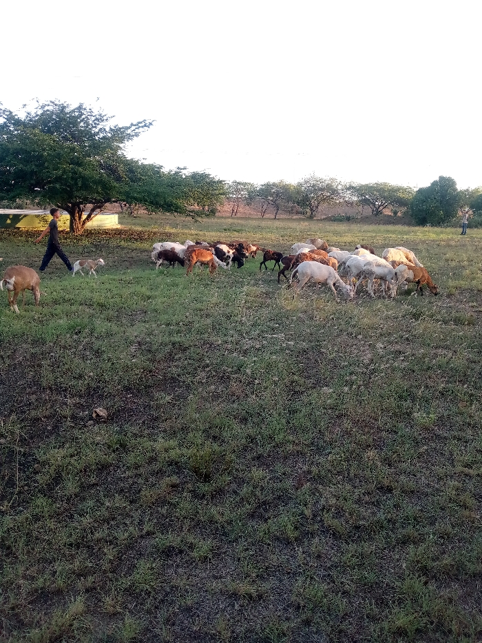 A pastoral scene presents a flock of sheep grazing on a field of grass. A person walks alongside the sheep, followed by a small lamb. A figure stands in the distance, near the edge of the field. Trees dot the horizon, and a water tank is visible behind the walking person. The landscape is bathed in a soft, possibly early morning or late afternoon light, casting shadows and highlighting the contours of the land.
