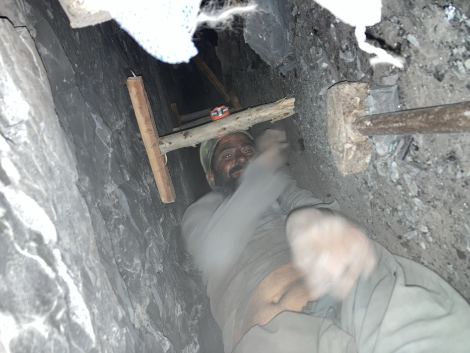 This image depicts a male individual within a confined, subterranean mine shaft in Duki, Pakistan