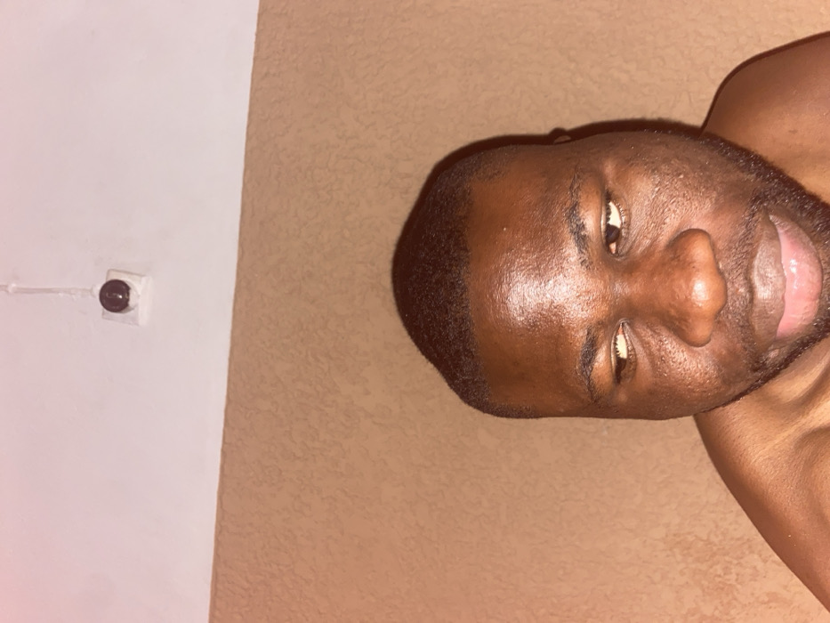 A close-up headshot of a dark-skinned man with a shaved head and visible stubble, set against a textured tan wall. His eyes are partially closed, and his mouth is slightly open, revealing his tongue. A white wall with a small, circular electrical component is visible in the background's upper-left corner. The man's skin appears shiny, possibly due to lighting or moisture. His upper body is partially visible, but without clothing.