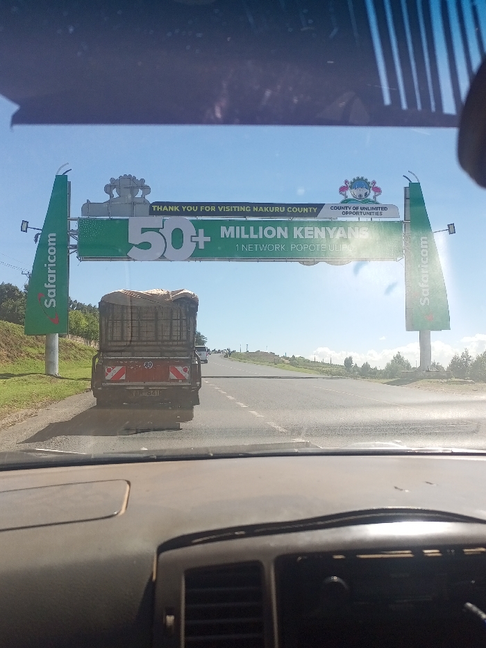 The image, captured from inside a vehicle looking through the windshield, depicts a sunny daytime scene on a paved highway in Kenya