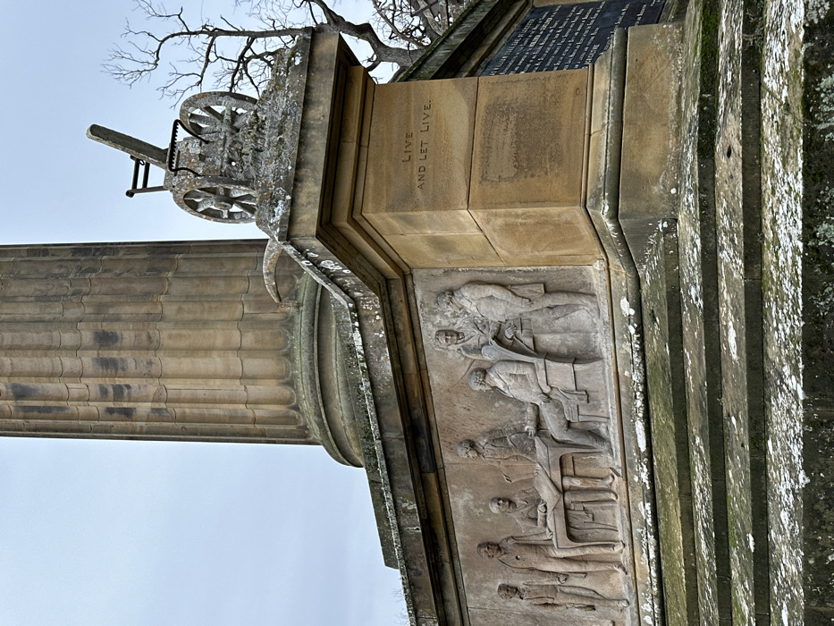 The image displays a detailed section of the Coke Monument (Thomas William Coke, 1st Earl of Leicester's Column) located in Holkham Park, Holkham, within the district of North Norfolk, United Kingdom. The central subject is a large, fluted classical column, constructed from weathered, light-colored stone, ascending from a square plinth. The visible face of the plinth features a stone relief sculpture depicting seven male figures in historical attire. One figure is seated at a table, another is seated in a prominent chair, and five other figures stand around them, appearing to be in a formal discussion or meeting. Above this relief, on the corner of the plinth, the inscription "LIVE AND LET LIVE." is carved into the stone. Resting on the top ledge of the plinth, at the base of the column, is a weathered stone sculpture of a wheeled cannon or field gun, heavily encrusted with lichen and moss. A similar, partial stone element is visible to its left. The base of the monument consists of multi-tiered stone steps, also covered in significant patches of moss and lichen. The environment features an overcast grey sky and the bare, gnarled branches of a deciduous tree visible against the sky on the right side of the frame.