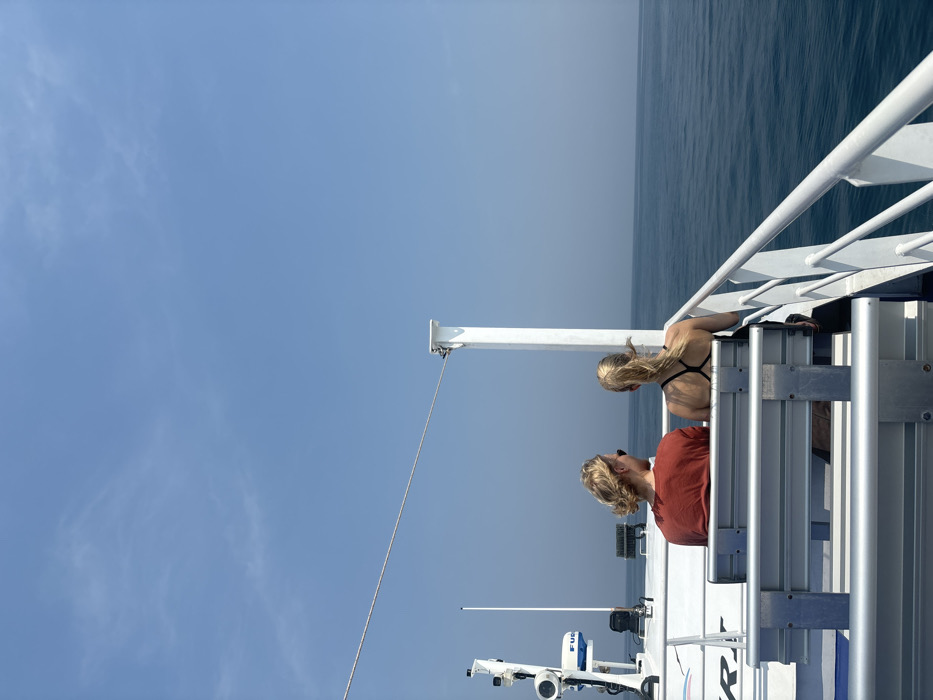 Two people stand on the deck of a boat, facing the water. The person in the foreground wears a rust-colored shirt and sunglasses, while the other wears a black swimsuit top. A white railing frames the edge of the deck, with the ocean stretching into the distance. The sky is a clear, pale blue with some faint wisps of clouds. Boat equipment is visible below the people, including a mast with a cable.