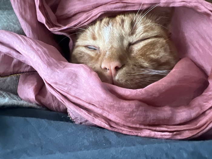 The image presents a close-up of an orange tabby cat. The cat is sleeping, with its eyes closed, and its head and upper body are wrapped in a pink, crinkled fabric, appearing as a soft scarf or light blanket. The fabric displays multiple folds and variations in texture. Visible features of the cat include its pink nose, white whiskers extending laterally, and distinct lighter orange fur markings on its forehead. A section of a grey textured fabric is partially visible beneath the pink material on the upper left. The lower frame reveals a dark blue or teal fabric, consistent with a bed or sofa covering. The visual data within the image does not provide sufficient information to determine a specific location in the city of Worthing, United Kingdom.