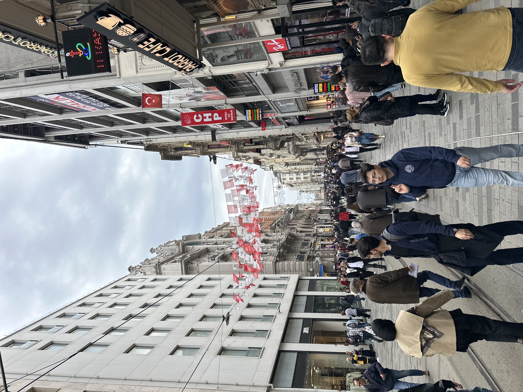 The image displays a bustling pedestrian thoroughfare in Beyoğlu, Turkey, under an overcast sky. The street extends into the distance, lined with buildings. On the left, a modern multi-story building with numerous windows occupies the foreground, featuring a "ZARA" retail store at ground level. Overhead wires, likely for a tram system, stretch across the street. Red and white banners, some displaying "CHP" (a political party), are strung in rows above the crowd. The right side of the street presents a mix of architectural styles, including ornate historic structures and contemporary storefronts. Prominent signage identifies "PARROT CAFE" with neon depictions of a hookah, coffee cup, and burger, and a "Ray-Ban" store. A large vertical banner for "CHP Beyoğlu İlçe Başkanlığı" (CHP Beyoğlu District Presidency) is visible, along with a Turkish flag and a "KIRALIK" (For Rent) sign on an upper floor. The paved street surface features parallel tram tracks. A dense crowd of pedestrians occupies the entire visible length of the street, with individuals walking, standing, and interacting. Most people are dressed in casual outerwear such as jackets, hoodies, and jeans. In the immediate foreground, a person in a beige jacket and black head covering walks away from the camera near the tram tracks. A young man with glasses, wearing a blue hoodie and light-wash jeans, stands centrally, making a hand gesture with his right hand. To the right, another individual in a yellow long-sleeved polo shirt walks away from the camera.