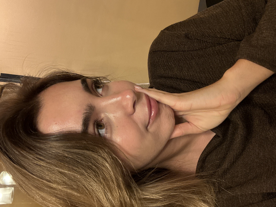 A woman with light brown hair and fair skin poses in a tilted headshot. She's wearing a dark brown top. Her hand is gently touching her cheek, accentuating her lips which appear glossy. Her makeup is minimal, enhancing her natural features. The background consists of a plain, light-colored wall. The lighting is soft and diffused, highlighting the texture of her skin and hair.