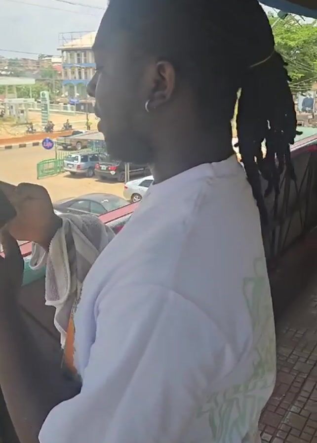 A man with dark skin and shoulder-length dreadlocks pulled back in a ponytail stands on a balcony, looking out at a street scene. He wears a white t-shirt with a colorful graphic design and a silver hoop earring in his left ear. He holds a black phone in his left hand and makes a gesture with his right hand, appearing to be talking. A white towel rests on his left arm. Behind him on the balcony, a man in a red shirt walks by. The street below is visible, showing cars, buildings, and people. The overall setting is bright and appears to be outdoors during the day.