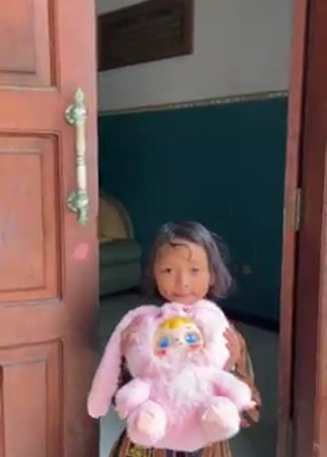 A young girl stands in a doorway holding a pink stuffed bunny doll