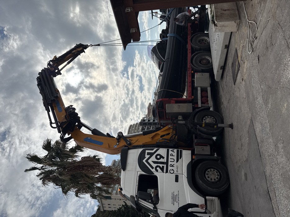 The image depicts an outdoor scene in Rafailovići, Montenegro, under an overcast sky. A white Volvo flatbed truck, marked with "219 GRUPA" and associated contact information, is centrally positioned on a cracked paved surface. The truck is equipped with a yellow and blue hydraulic knuckleboom crane, which is extended upwards and to the right, with a hook and chains descending towards a wooden beam structure featuring metal attachment brackets, suggesting ongoing construction or dismantling activity. On the truck's flatbed, a large, dark-colored rigid inflatable boat (RIB) with a console is secured. Two male individuals are present: one is partially visible on the far left, near the truck's cabin, wearing dark attire; the other is crouching on the right side of the truck's flatbed, near the stern of the boat, wearing a light-colored long-sleeved shirt and dark pants. In the background, a large palm tree with visible dry fronds stands to the left, adjacent to multi-story buildings. Further buildings are visible in the right background. Several concrete slabs and a concrete planter are situated on the ground in the foreground. The truck's outriggers are deployed for stability.
