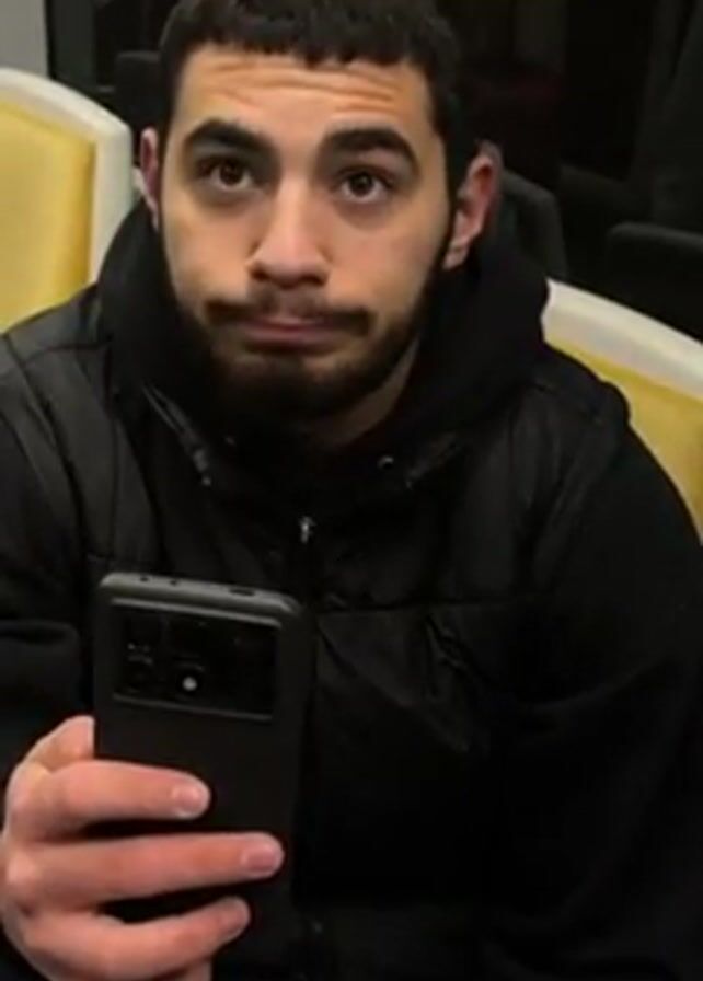 A young man with short dark hair and a trimmed beard sits on a train, absorbed in his phone