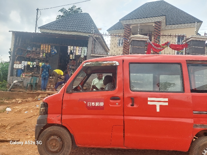 The scene depicts a street in Umudioka, Nigeria. In the foreground, a red, right-hand drive mini-van, bearing the "日本郵便" (Japan Post) text and logo in white, is parked on an unpaved, reddish-brown dirt surface. Inside the van, an adult male driver in a light-colored shirt is visible behind the steering wheel, and a dark-skinned young person in a checkered shirt occupies the front passenger seat. To the left of the van, a dilapidated single-story store or shack with a dark corrugated roof is present. Goods are displayed and hanging from its open front. Two plastic chairs are outside. On the concrete steps leading to the store, an adult male in a blue patterned shirt stands with his back to the viewer. Another individual in a yellow shirt is crouched near the steps, interacting with a small child dressed in purple. A grey pipe structure is affixed to the left side of the store. Overhead power lines are visible above this structure. In the background, behind the store and to the right of the van, a two-story, modern residential house with a dark, multi-gabled roof and a light-colored exterior stands behind a black metal fence with white pillars. Red fabric garlands are draped across the fence, suggesting decoration. The sky is overcast, and sparse trees are visible in the distance.