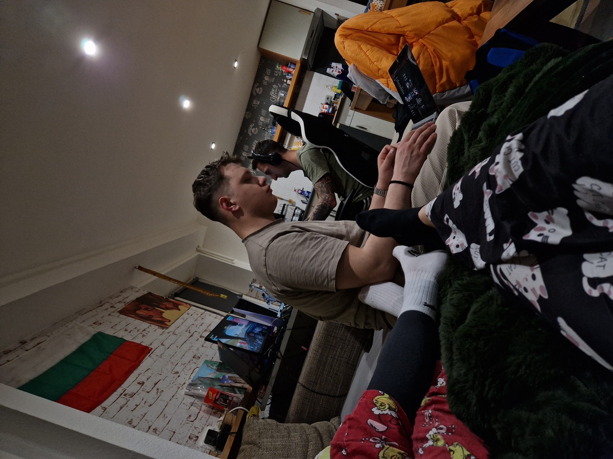 This image depicts an indoor scene in Leidersbach, Germany, observed from a low, reclined perspective. The environment appears to be a casual living space transitioning into a kitchen area. In the immediate foreground, the legs of an individual are visible. The left leg wears red pajama bottoms with yellow cartoon patterns and dark grey leggings. The right leg wears black pajama bottoms with white cat print and a black sock. A dark green faux-fur blanket covers the lap area between the legs. In the mid-ground, a light-skinned male with short, dark, faded hair is seated, facing downwards and slightly to the left. He wears a light brown short-sleeved t-shirt and light-colored pleated pants. His left foot, wearing a white sock with a dark logo, is partially visible. He wears a silver wristwatch and a dark bracelet on his left wrist, with his hands positioned over an unidentifiable dark electronic tablet or small laptop resting on his lap. The device displays a graphical user interface with multiple thumbnails. In the background, another light-skinned male with short, dark hair is seated in a black and white gaming chair, facing away from the camera and towards a monitor. He wears a dark olive green short-sleeved t-shirt and over-ear headphones. Visible tattoos are on his left forearm. Behind him, on a shelf, a flat-screen monitor displays a video game scene with an in-game interface. To the left of this setup, a plastic bottle, possibly containing a beverage, is present. The wall behind the gaming setup features white brick-patterned wallpaper. A Bulgarian flag (horizontal white, green, and red stripes) is mounted on this wall, above a framed poster depicting an anime-style character with brown hair. A golden, cylindrical decorative object hangs vertically from the ceiling near the flag. To the right of the gaming setup, the room transitions into a kitchen area with light-colored cabinets, shelves, and various items displayed on them. Recessed lighting fixtures are visible in the white ceiling. An orange puffy jacket or blanket is draped over an object on the far right.