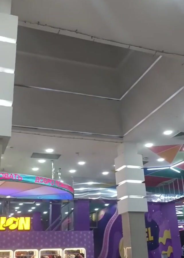 n interior shot of a brightly lit and decorated space, likely a shopping mall or entertainment center. The camera angle is looking upwards, showcasing the high ceiling with a network of pipes and tracks. There are a number of lights scattered across the ceiling. Thick, white structural columns with segmented designs and integrated lighting reach from the floor to the ceiling. In the background, there's a colorful children's play area, identifiable by signage with words like "PIXEL" and "HANDIWORK" in English, and "ДЕТСКАЯ ЗОНА" in Russian, which translates to "Children's Zone." The area is decorated with geometric shapes and vibrant colors, predominantly purple and teal. There are people moving around and sitting in what appears to be a food court area in the foreground.