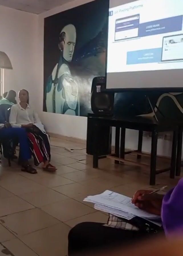 The video depicts a classroom setting with a presenter giving a lecture on job posting platforms. The presenter, visible in silhouette, stands in front of a projection screen displaying details of job-posting platforms such as Jobberman and LinkedIn. The classroom contains several students, some of whom are seated and taking notes. A mural of a robot or android figure is visible on the wall behind the presenter. The room has tiled flooring and appears well-lit. The camera view is partially obstructed by someone in the foreground, and the video is generally shaky.