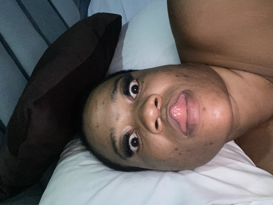 A close-up, eye-level image depicts an adult individual with a dark complexion, short dark hair, and extended false eyelashes, lying on a bed in Galadimawa, Nigeria. The subject's head rests on a white pillow positioned on the left. A dark brown pillow is visible in the upper right quadrant of the frame, adjacent to a faint blue-grey background element. The individual's eyes are wide open with dilated pupils, and the tongue is visibly protruding from between pursed, upward-curved lips, indicating an intentional facial expression. The upper chest and right shoulder are partially visible on the lower right, beneath dim ambient lighting. Minor skin blemishes are present on the face.