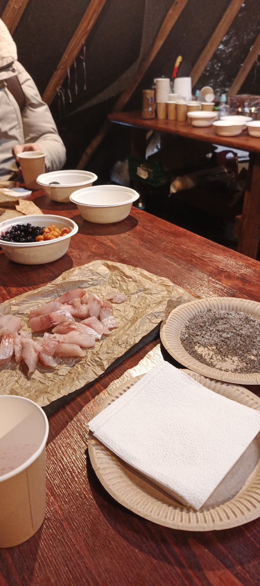 wooden table inside what appears to be a yurt-like structure with a pitched roof, likely in Naryan-Mar, Russia. On the table are several items: a white bowl containing mixed berries (dark blue and orange), a piece of brown paper with cut pieces of pink fish, a paper plate with a mixture of salt and pepper, and a paper plate with white napkins. There are also empty white bowls and paper cups scattered on the table. A person wearing a beige jacket is partially visible on the left. In the background, there is another table with stacked paper cups, bowls, and a bottle. The lighting suggests an indoor setting, potentially a communal eating area.