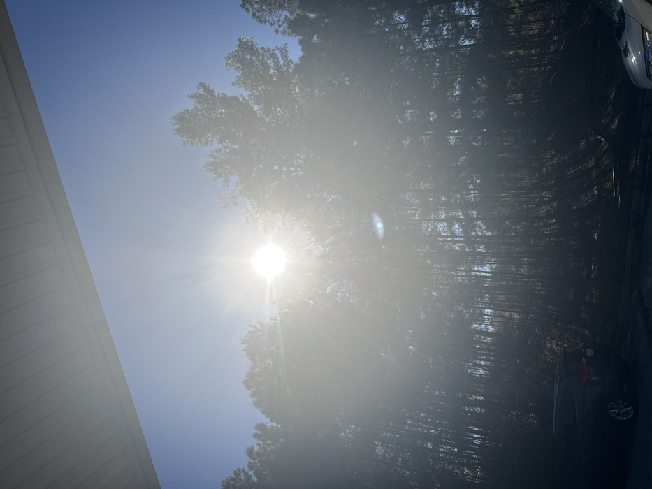 A bright sun dominates the center, surrounded by a hazy glow. Trees with dense foliage line the right side of the frame. A white roof or building structure is visible on the left. The sky is a clear blue. Two vehicles are partially visible on the right side of the image. The overall scene conveys a sunny day, possibly in a wooded area.