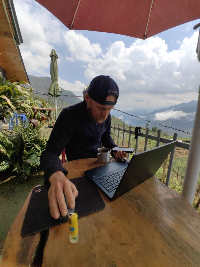 A male individual with a beard, wearing a dark blue Columbia baseball cap and a dark blue long-sleeved top, is seated at a rustic wooden table under a partially visible red umbrella. His right hand operates a black computer mouse on a black mousepad, while his left hand holds a black smartphone. An open black laptop rests on the table in front of him. A stainless steel mug, containing a dark liquid, is positioned next to the laptop, and a yellow lighter with a blue design is also on the table. In the immediate background to the left, green foliage, blue plastic chairs, and a light-colored wooden building structure are visible, along with a closed green patio umbrella. Beyond a metal railing, the environment transitions to a vast mountainous landscape with terraced fields and valleys partially obscured by low-lying white clouds under a blue sky with scattered clouds. The scene is located outdoors in Tả Van, Vietnam.
