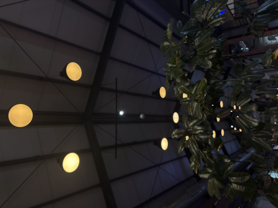 A dark ceiling structure with linear patterns intersected by beams hosts multiple spherical light fixtures. The lights vary in proximity and brightness. Green foliage, possibly a climbing plant, obscures portions of the ceiling and lights on the right side of the image. Some reflections are visible on the ceiling. The scene is dimly lit and creates a sense of depth with the perspective.
