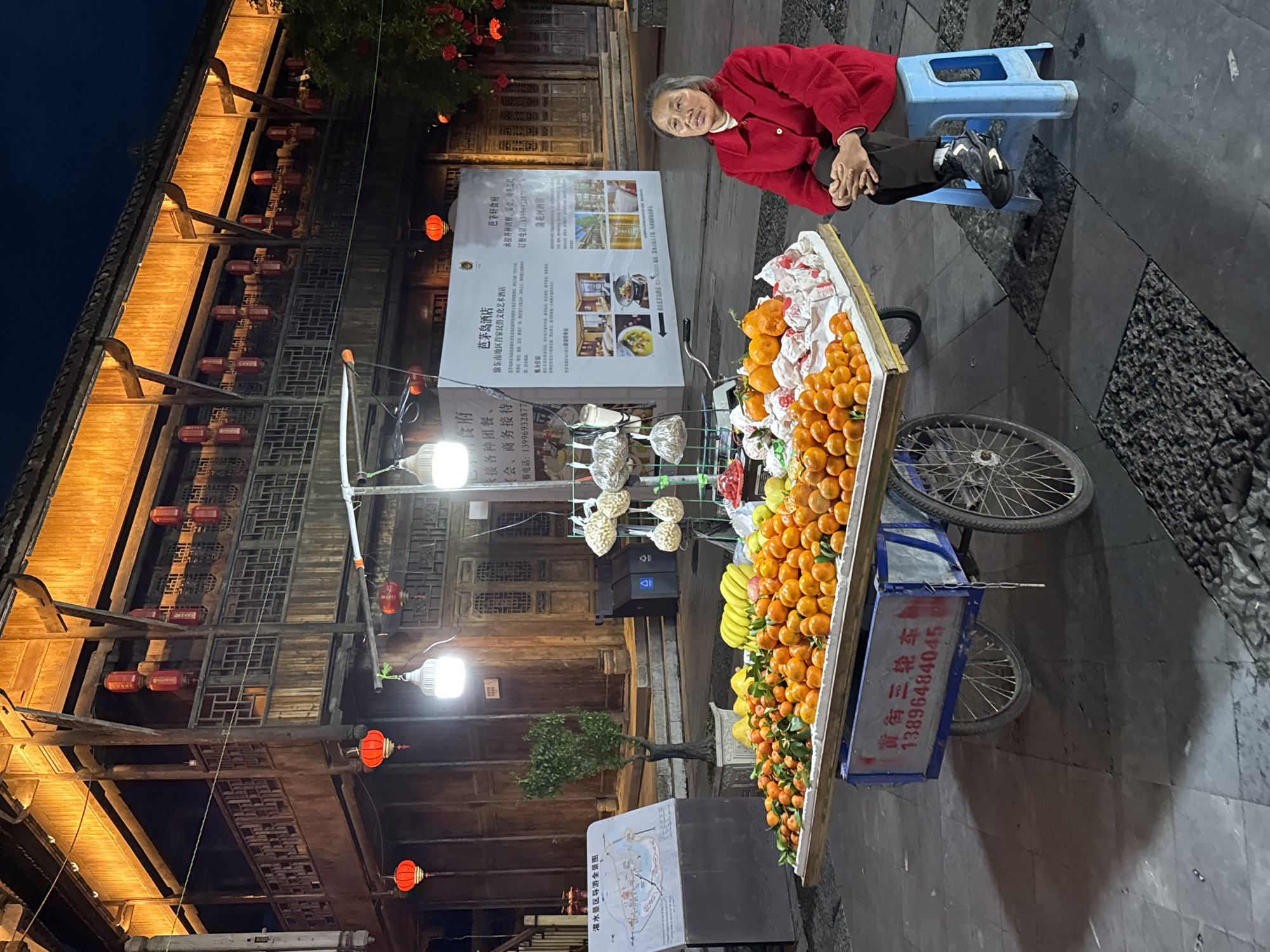 An older woman sits on a blue plastic stool next to a cart filled with fruit, including oranges, tangerines, bananas, and pears, in the city of Zhuoshui, China. The cart also displays decorative gourd-shaped items. A sign behind the cart advertises the "Ba Mao Island Hotel," including a map of Zhuoshui Scenic Area, along with phone numbers and descriptions of the hotel's dining options. Red lanterns decorate the wooden buildings in the background. The pavers on the street are a mix of gray and black stones.