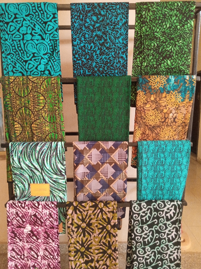 The image displays a multi-tiered, dark-colored metal rack holding twelve distinct pieces of folded, patterned fabric. The fabrics are presented in three columns and four rows. Row 1 (top), from left to right: 1. Teal fabric with intricate black abstract or organic swirl patterns. 2. Blue fabric featuring a dense pattern of black, stylized foliage or leaf shapes. 3. Green fabric with an irregular, mottled, or speckled pattern in black. Row 2, from left to right: 1. Olive green and gold fabric with a prominent circular, geometric, or mandala-like design. 2. Solid dark green fabric exhibiting a subtle, textured pattern resembling herringbone or small zig-zags. 3. Brown and gold fabric adorned with large, stylized gold floral patterns and interspersed teal-blue leaf motifs. Row 3, from left to right: 1. Green, white, and black fabric displaying dynamic wavy or flowing patterns. A rectangular yellow-brown label, partially visible in the lower left quadrant of this fabric, reads "ANASARE". 2. Blue, brown, and grey fabric featuring a repeating geometric pattern of interlocking squares, some containing small dotted textures. 3. Teal fabric with a uniform, repetitive pattern of stylized shapes, possibly abstract birds or geometric figures. Row 4 (bottom), from left to right: 1. Maroon and pink fabric with an abstract, mottled, or batik-like pattern. 2. Olive green and black fabric with a recurring pattern of stylized floral or star-like elements. 3. Black fabric featuring bold white or light-colored abstract swirls and organic, foliage-like motifs. The background consists of a plain, light-beige or cream-colored wall, visible between and behind the displayed fabrics. The setting is indoors, consistent with a textile retail establishment, market stall, or exhibition space commonly found in the city of Kaduna, Nigeria. No individuals are present in the frame.
