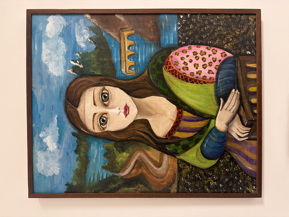 An framed oil painting of a cartoonish woman in a green and purple gown with a pink leopard-print shawl. She has large brown eyes and red lips. The background shows a blue sky with white clouds, a river, and trees on the left and a dark area with gold dots on the right. A wooden bridge is above her head. She is sitting on a brown chair with her hands clasped.