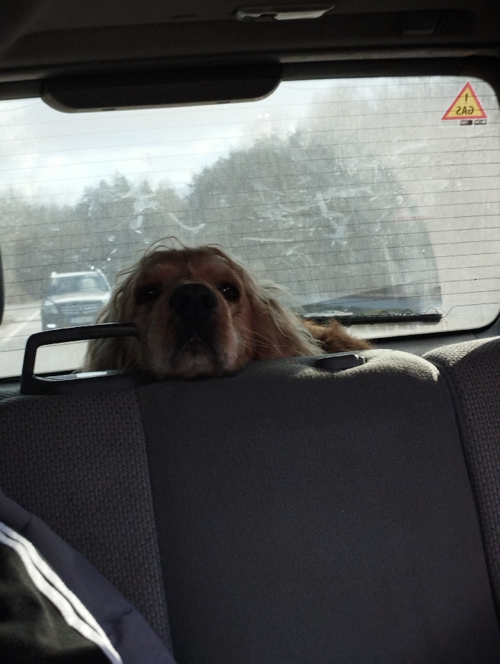 - "A light brown, long-haired dog is observed from within a vehicle, positioned with its head resting on the top of the rear seat, looking forward through the rear window" by FM-o242R2, licensed under CC BY 4.0